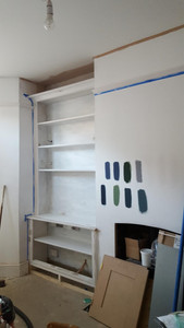 We went for Farrow and Ball - 'Green Smoke' in the end. A smokey green blue 'evoking calm and serenity' or, as Jon put it, Khaki. At this point, I feel the need to confess. Neither of us really had any idea what colour we wanted for this room, so we tried out alot of options, some quite random and extreme, and others more neutral. Jon liked a couple and got particularly attached to a deep blue, but for me it still wasn't quite right.